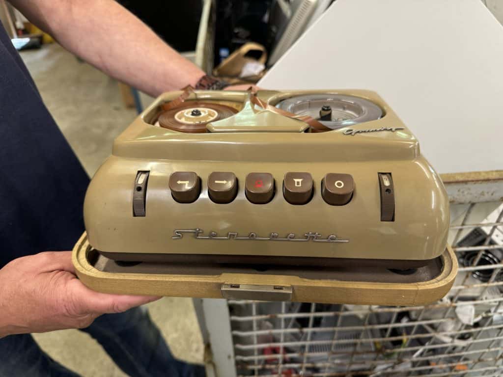 Fun-fact: In der Werkstatt wurde auch eine jahrzehnte alte Stenorette gefunden, die entsorgt werden soll. Wer kann sich noch an solche Geräte erinnern?